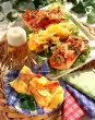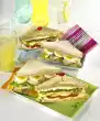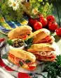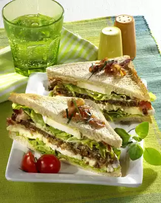 Toast the sandwich bread in a toaster. Wash parsley, dab dry and cut into fine strips. Spread slices of bread with salad cream, combine with the prepared ingredients to a sandwich and place the wholemeal bread in the middle. Press lightly and cut in half diagonally. Serve the sandwich on a platter, garnished with crumbled bacon, parsley strips, cherry tomato and marjoram