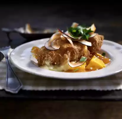 Turn cheese one after the other first in flour, then in egg and coconut breadcrumbs. Heat oil to 170 °C. Fry 2 cheese halves one after the other for about 3 minutes in hot oil until crispy. Place the finished cheese on kitchen roll. Arrange cheese on mango chutney. Garnish with coconut chips and parsley