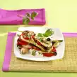 Clean, wash and cut the salad into strips. Wash, quarter, seed and slice the tomatoes. Peel onion and cut into small cubes. Season vinegar with salt and pepper, add oil.