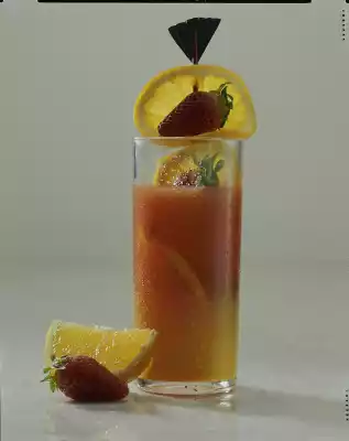 Give long drink glass with ice cubes. Fill up with orange juice. Put a skewer with strawberries and orange slices as garnish in the glass. Serve immediately