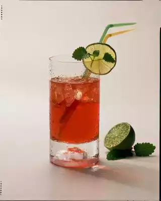 Put Campari, rum, lemon juice and about 3 - 4 ice cubes into a glass. Top up with chilled tonic water. Serve with lime, mint and straw