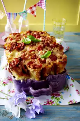 Ca. 1⁄3 Spread the béchamel in an ovenproof dish (approx. 15 x 24 cm; min. 6 cm high). Place the cannelloni close together vertically in the dish. Approx. 3⁄4 Spread the Bolognese in the cannelloni. Spread the rest of the béchamel on top.