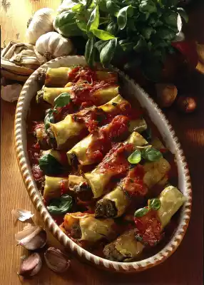 Place the cannelloni on top, pour the rest of the sauce over them and bake in a preheated oven (electric: 175°C/ gas: level 2) for about 40 minutes. Serve garnished with basil leaves.