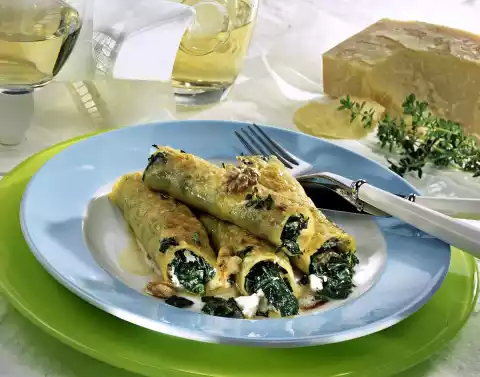 Fill the cannelloni with the chard and ricotta mixture. Place in an ovenproof dish (28x15 cm, 1 litre capacity) and sprinkle with the Parmesan cheese. Pour on the stock and cook in the preheated oven (electric cooker: 200 °C/ gas: level 3) for about 30 minutes. In the meantime wash the thyme, dab dry and pluck. Coarsely chop the walnuts. Heat butter in a pan, brown lightly, add nuts and thyme. Arrange cannelloni on plates and sprinkle with the nut butter