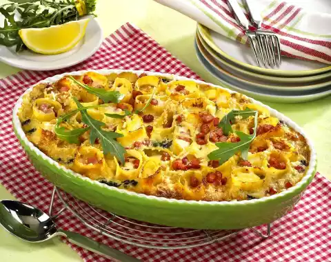 Place the cannelloni upright on top. Fill the ricotta-ham mixture in a piping bag and squirt into the cannelloni. Spread the rest of the béchamel into the gaps between the cannelloni. Grate the Parmesan finely. Sprinkle the rest of the ham cubes and parmesan on top. Bake in the preheated oven (electric cooker: 200 °C/ convection oven: 175 °C/ gas: level 3) for about 15 minutes until golden brown. Remove and serve garnished with the remaining rocket