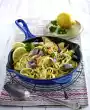 Add tomatoes and stock and simmer covered for about 6 minutes. Cook pasta in boiling salted water for about 5 minutes until al dente. Roast pine nuts in a pan without fat until golden brown. Coarsely chop the spinach.