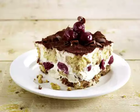 Spread the cherries, except for a few for decoration, on the cream. Place the rest of the cantuccini on top and sprinkle with the rest of the espresso. Spread the rest of the cream on top. Chill for about 3 hours.