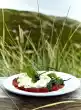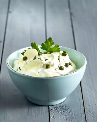 Mix the double cream cheese with milk, garlic, parsley, capers and lemon rind. Season with salt and pepper.