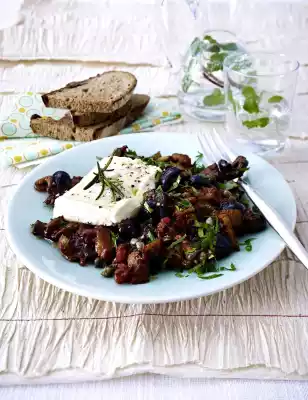 Remove the feta from the aluminium foil. Sprinkle Caponata with parsley and arrange on plates with baked feta. Tastes good with farmhouse bread