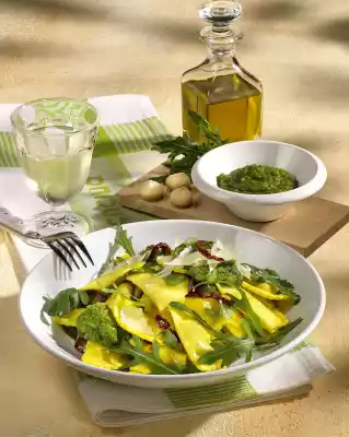 Heat the fat in a frying pan. Toss the cappelletti and tomatoes in the hot fat for 1-2 minutes. Mix with rocket and pesto. Cut the rest of the Parmesan cheese into little curls with a peeler and sprinkle on the Cappelletti.