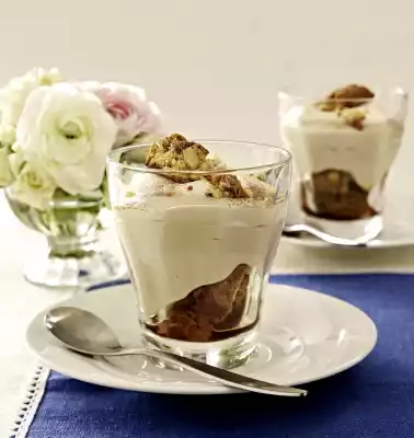 Dissolve 1 tablespoon of espresso powder in 8 tablespoons of hot water. Add liqueur. Coarsely crumble the biscuits and, except for 2 tablespoons, distribute them into the dessert glasses. Sprinkle with prepared coffee-liqueur mixture