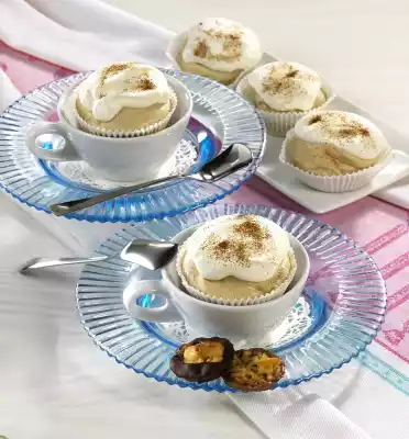 Mix espresso powder and 2 tablespoons of hot water. Leave to cool. Place 2 paper cups in the recesses of each muffin tray (for 12 cups) and place 1 cookie in each