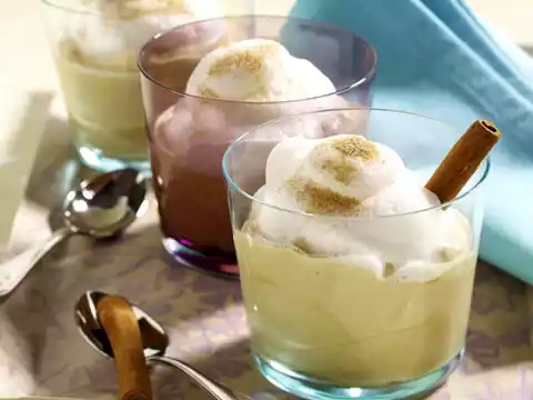 Mix cinnamon and 1 tablespoon of sugar. Froth 200 ml of milk using a milk frother or heat it up in a pot and froth it up by stirring vigorously with a whisk. Pour the milk foam onto the pudding and sprinkle with cinnamon sugar.