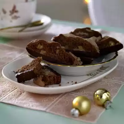 Remove biscotti from the oven and let them cool down. Roughly chop the chocolate. Melt coconut oil and chocolate coating in a bowl over a warm water bath. Cut biscotti into slices and dip them with the underside into the chocolate. Remove the chocolate and place the biscotti on a cake rack. Refrigerate for about 1 hour until the chocolate is firm