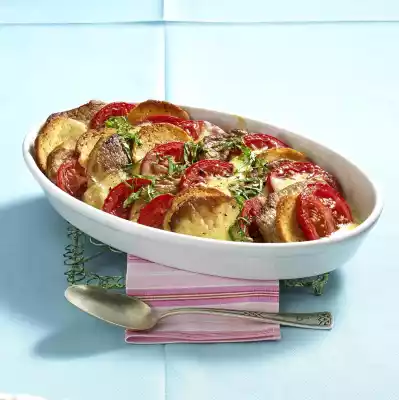 Season with salt and pepper. Spread butter in flakes evenly on the ingredients. Bake in a preheated oven (electric cooker: 200 °C/ convection oven: 175 °C/ gas: level 3) for 20-25 minutes. Wash basil, shake dry, pluck leaves from the stalks and cut into fine strips. Sprinkle over the casserole