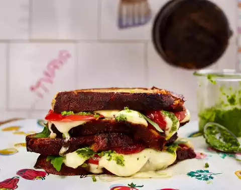 Heat 1 tablespoon of oil in a large frying pan. Put sandwiches in it. Roast on each side at medium heat for about 2 minutes, weighting down with a second pan or a large saucepan. Arrange the sandwiches and the remaining pesto.