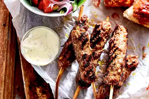 Mix vinegar, salt and pepper. Fold in 4 tablespoons of oil. Mix with lamb's lettuce, cucumber, tomatoes and onion strips. Pass to the skewers. Serve with flat bread spread with Ajvar and herb sour cream.