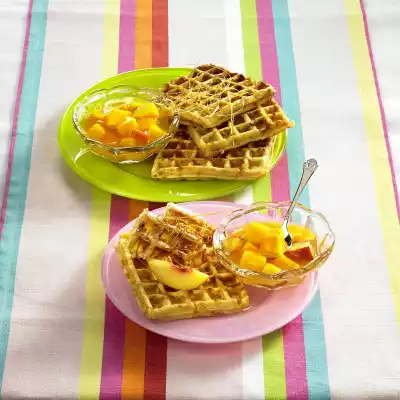 Stir in fruit cubes. Mix cornflour with a little water and thicken the compote. Bring to the boil again, fill into 4 bowls and let cool. Chop the caramel sweets very finely. Cream butter, 75 g sugar, vanillin sugar and salt. Stir in eggs one after the other. Mix flour and almonds alternately with milk and sour cream into the dough. Stir in caramel pieces. Preheat waffle iron, spread with oil and bake 8 waffles one after the other.