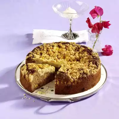 Slowly stir the nut nougat into the mixture. Mix 400 g flour and baking powder and stir in alternately with the milk. Fold the sweets into the dough. Chop the caramel finely and mix with the crumbles. Pour the dough into a greased and flour-spread springform pan (26 cm Ø). Spread the crumbles on the dough and bake in a preheated oven (electric cooker: 175 °C/ convection oven: 150 °C/ gas: level 2) for approx. 1 hour. Take the cake out of the oven, remove from the edge and let it cool down on a cake rack