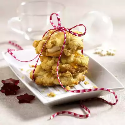 Melt 50 g butter. Mix 75 g flour, 50 g brown sugar and caramel vanillin sugar. Add liquid butter and knead into crumbles with the hand mixer