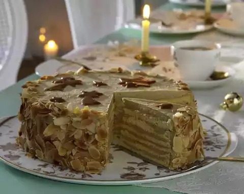 Immediately remove carefully from the base and let it cool down on a cake rack. Bake 5 more bases from the dough. Put almonds on a baking tray and roast in the oven at the same temperature for 3-4 minutes. Take them out, put them on a plate and let them cool down. Whisk the butter with the whisk of the hand mixer until white and creamy. Stir the pudding until smooth and stir into the butter by the spoonful. Spread the cake base with cream and mix together. Spread the rim with cream as well. Press the flaked almonds to the edge. Chill the cake for at least 1 hour. Cut the caramel sweets into small pieces and put them in a small pot with the cream and melt them at low heat. Spread on a piece of baking paper and let it cool down. Cut out stars and shooting stars of different sizes and decorate the cake with them before serving