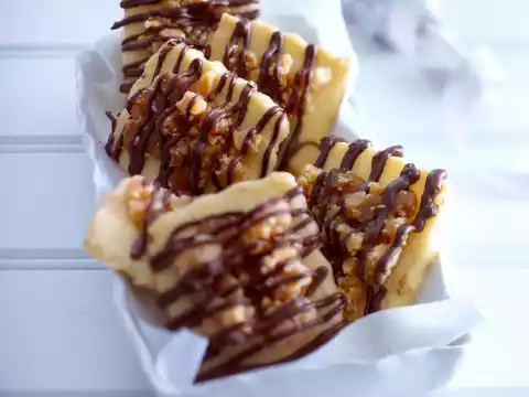 Roughly chop the sweets. Sprinkle on the hot biscuits and bake for about 3 minutes. Allow to cool for about 1⁄2 minute. If the toffee mixture does not stick completely to the biscuits, press on a little. Let them cool down.