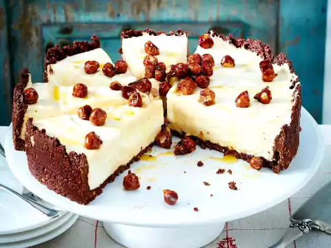 Carefully remove the cake from the tin and sprinkle with the roasted hazelnuts. Sprinkle with caramel syrup to serve.