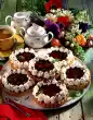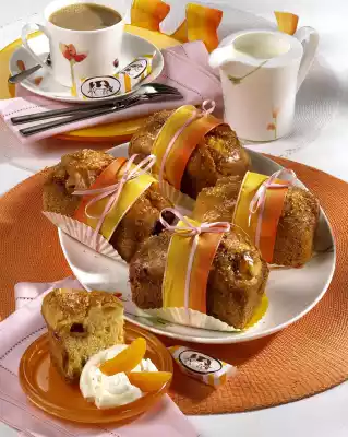 Roughly chop the sweets. Cut the apricots into small cubes. Cream fat, salt, sugar and vanilla sugar with the whisk of the hand mixer. Stir in the eggs bit by bit. Mix flour and baking powder, add and stir in. Stir in milk. Carefully fold in sweets and apricots. Grease mini king cake tin (contents 6 x 200 ml) and sprinkle with breadcrumbs. Spread the dough evenly. Bake in the preheated oven (electric cooker: 175 °C/ convection oven: 150 °C/ gas: level 2) for approx. 25 minutes. Remove from the oven, let it cool down on a grid and carefully lift it out of the trays. Heat up the apricot jam and pass through a sieve. Spread the cake with it and sprinkle with brown or coloured sugar. Serve muffins with cream
