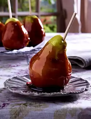 Remove the lid from the pot and place the sugar thermometer in the pot. Heat the caramel further until the thermometer reads 140° C. Remove the pot from the stove and immediately place it in a cold water bath. Grasp pears one after the other by their stems and quickly cover them with the caramel until they are well coated. Drain excess caramel into the pot. Place the pears on a baking tray lined with baking paper. If necessary, reheat caramel for remaining pears. Let the caramel harden on the pears