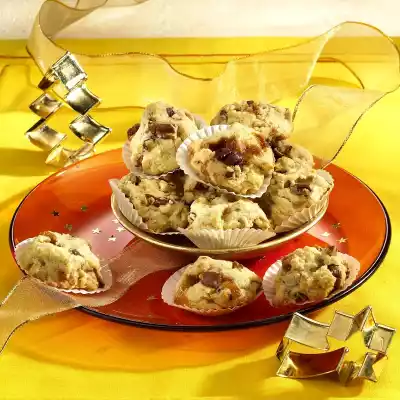 Fold in diced candy and nuts. Place the dough by the teaspoon on 3 baking trays lined with baking paper with a large gap between them. Bake the trays one after the other in a preheated oven (electric cooker: 200 °C/ convection oven: 175 °C/ gas: level 3) for 12-15 minutes.