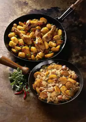 Fry the potatoes, corn and peas for about 5 minutes, turning them over. Fry the chilli rings briefly. Season with salt and pepper. Arrange chicken legs on top.