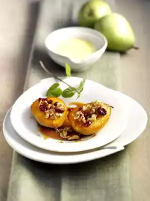 Chop and roast the walnuts and mix them with the cranberries. Arrange the pear halves with the caramel syrup and sprinkle with the walnut-cranberry mixture. Serve garnished with mint.