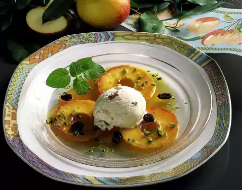 Heat them briefly. Chop the pistachio seeds. Arrange the apple rings with some caramel sauce, chopped pistachios and a scoop of walnut ice cream on plates. Serve garnished with mint