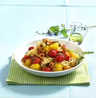 Add 3 tablespoons of oil to the frying fat. Add tomatoes, season with salt and pepper. Sprinkle with brown sugar, turn. Add sage, caramelise over high heat for about 3 minutes. Drizzle with vinegar, pour on stock, add turkey cubes again, bring to the boil briefly. Arrange the spaghetti in portions on plates