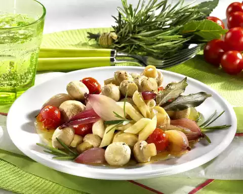 Strip rosemary needles from the stem. Melt the sugar in a pan until golden brown. Add garlic and bay leaf. Deglaze with vinegar and 200 ml water. Cook the mushrooms and shallots for about 10 minutes.