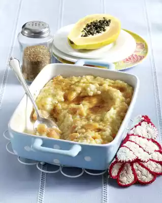 Stir the papaya into the rice pudding about 10 minutes before the end of cooking. Finally, stir in butter and 2 tablespoons of sugar. Remove the pan from the heat, remove the vanilla pod and lemon peel.