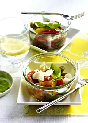 Parmesan cheese in shavings. Season the peppers with salt and pepper again, then arrange in bowls. Sprinkle with cheese and sprinkle with the remaining olive oil. Garnish with basil leaves before serving. Bread tastes good with it