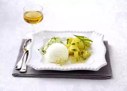 Halve the orange and squeeze the juice. Add tarragon to the pineapple, deglaze with orange juice. Arrange pineapple and pistachio mousse on plates. Form ice cream into balls and arrange on plates. Possibly with sugar spirals and