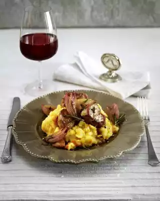 Heat milk and butter. Drain potatoes and carrots. Add the milk and butter and mash with a potato masher until mashed. Arrange puree on plates. Spread the meat and shallots on top