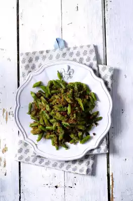 Clean, wash and cut the beans into short pieces. Cook with savory in boiling salted water for 8-10 minutes. Drain and let drain well. Remove the savory. Heat the butter in a large pan.