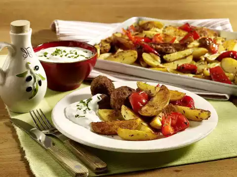 Clean, wash and cut the peppers into pieces and after 5 minutes add them to the potatoes. Peel and finely chop the onion. Knead minced meat, egg, onion, tomato paste and breadcrumbs. Season with salt, pepper and paprika powder.