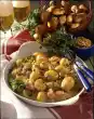 Mix curd cheese and mineral water. Season to taste with salt, pepper and sugar. Fold in herbs. Arrange caraway potatoes with meatballs and curd together.