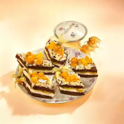 Heat 3 tablespoons of lime juice, remove from heat. Squeeze 8 sheets of gelatine well and dissolve in it. Gradually add the gelatine to the buttermilk while stirring. Chill for about 30 minutes, stirring occasionally. In the meantime, drain the mango, drain and finely puree. Heat 2 tablespoons of lime juice and remove from the heat. Squeeze 3 sheets of gelatine well and dissolve them in it. Mix the gelatine with 2-3 tablespoons of puree, then stir into the rest of the puree. Do not refrigerate! Whip 400 g cream and vanillin sugar until stiff, stir into the almost gelatinised buttermilk. Spread the cream and mango puree alternately on the base, carefully place the lid on top. Chill for about 5 hours. Roast the remaining coconut chips in a pan without fat, remove. Cut the cake into pieces with a very sharp knife. Serve decorated with mango wedges and physalis. Sprinkle with roasted coconut chips