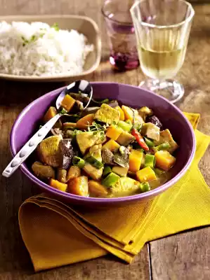 Heat the oil in a large pan or frying pan. Fry the meat for about 2 minutes while turning it. Add aubergine, pumpkin, garlic, onion and the white of the spring onions and fry for about 2 minutes.