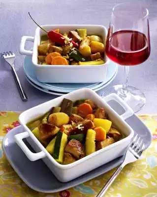 In the meantime, clean, wash and dry aubergine and zucchini and cut them into sticks. Peel, wash and halve the potatoes. Peel and slice carrots. Wash lemon hot, grate dry, finely grate peel.