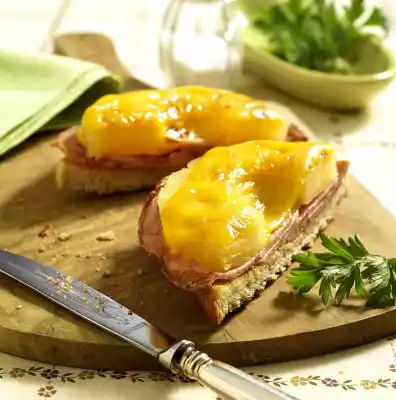 Toast the toast, let it cool down a bit and spread with fat. Cover with sausage, pineapple and cheese in the order given. Place slices of toast on a baking tray. Bake in a preheated oven (electric cooker: 200 °C/ convection oven: 175 °C/ gas: level 3) for approx. 5 minutes until the cheese is lightly browned. Garnish with parsley