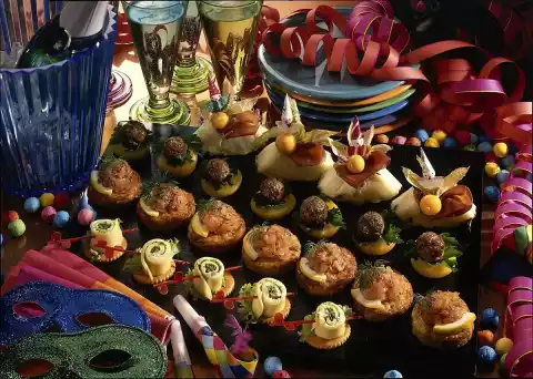 Place cheese in flakes (30 cm long) on foil. Spread with cream cheese and seasoning mixture. Roll up with the help of the foil, chill for approx. 15 minutes, then cut into approx. 2 cm wide rolls and place on crackers topped with salad. (15 pieces). Spread the deep-frozen Rösti Taler on the baking tray. Bake in the preheated oven (electric cooker: 200 °C/ gas: level 3) for 12-15 minutes. Finely dice the salmon. Finely chop the dill, except for a few flags. Mix both. Season with lemon juice and pepper and serve on the talers. Garnish with lemon wedges and dill flags. (16 pieces). Drain the apricots. Fry the meatballs in hot oil for about 10 minutes while turning. Then place a parsley leaf in each apricot half and place a meatball on top (20 pieces). Cut the pineapple into 5 thick slices. Cut out the stalk. Cut the slices into quarters. Stick 1 slice of ham and 1 Cape gooseberry on each slice. (20 pieces)