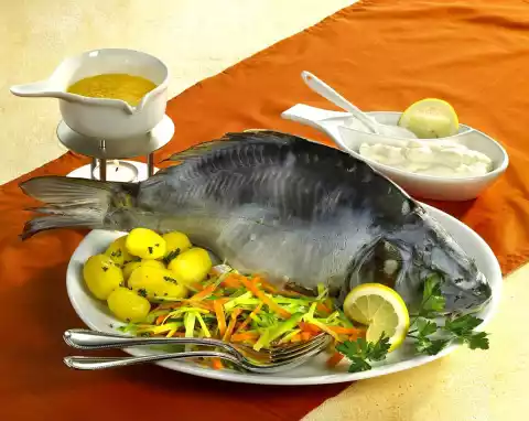 Peel and wash 1 carrot. Peel the onion and lard with cloves. Boil the carrot, onion and peppercorns in a large pot with 2 litres of water, 1/8 litre of vinegar, white wine, lemon juice, 1 teaspoon of salt and 1 teaspoon of sugar. Carefully wash the carp under cold water and season inside with salt and a little pepper. Place an inverted cup in the carp belly so that the carp can be placed on a plate. Bring 1/8 litre vinegar to the boil in a small pot and pour it evenly over the carp until it is blue.