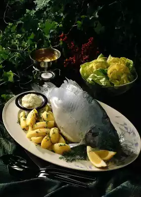 Carefully clean and wash the inside of the carp and salt it from the inside. Bring vinegar and 1/2 litre water to the boil and pour over the carp. Leave to stand for 5-10 minutes. Peel and wash potatoes and cook in salted water for about 20 minutes.