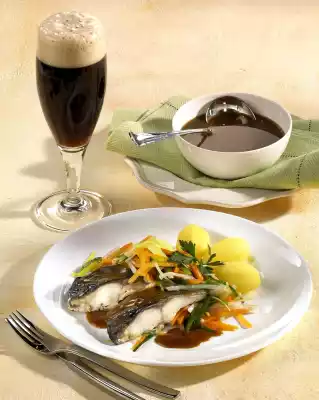 Steam the vegetable strips in little boiling salted water for 3-5 minutes. Season the sauce to taste, beat butter into it. Arrange carp pieces with sauce and vegetable strips. Boiled potatoes taste good with it